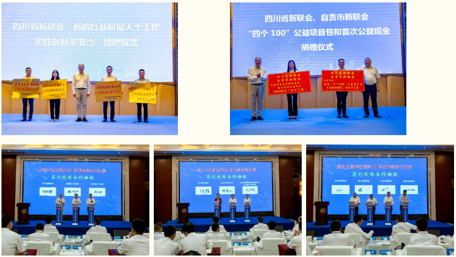 活动期间,省新联会、自贡市文化旅游投资开发有限公司与上合组织国家多功能经贸平台农文旅文化服务工作委员会签订战略合作协议,省新联会与富顺县政府、自贡航空产业园签订战略合作协议,自贡、遂宁、内江、资阳四市新联会之间也签订战略合作协议。同时,举办了省新联会、自贡市新联会“四个100”公益项目包和首次现金捐赠仪式,充分展现了省市两级新联会的善行义举和责任担当。