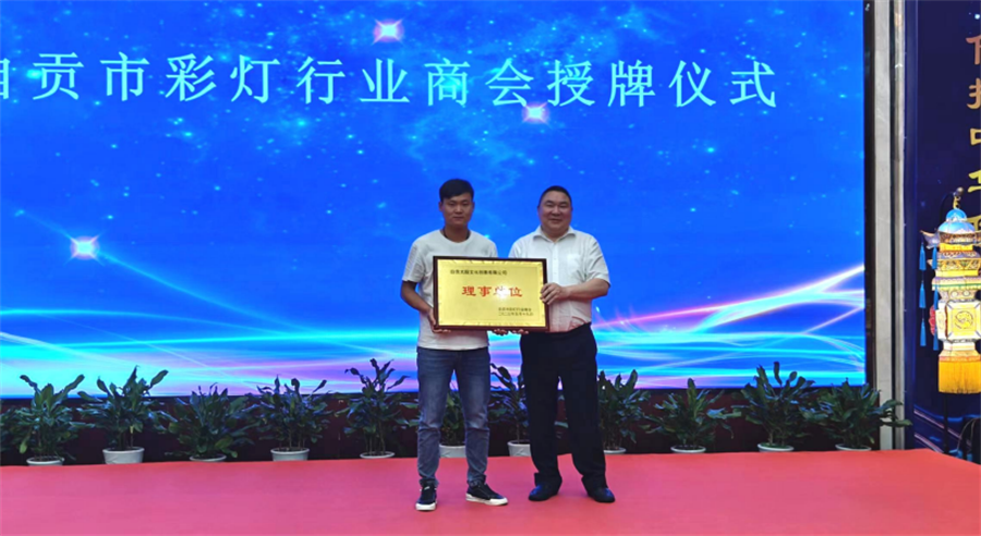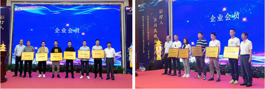 第三阶段议程:为升级会员和新入会会员授牌。会员升级为理事单位的有:自贡太阳文化创意有限公司;新入会会员11家,他们是:博蕴彩灯、四海物流、大鲲文化、希悦经营部、碧诚彩灯、北斗美术工作室、润锦文化、光语文化、万鼎文化、文翔彩灯。自贡市窖龄商贸有限公司;商会会长黄德春,党委书刘成、常务副会长周家禄为新入会会员授牌。