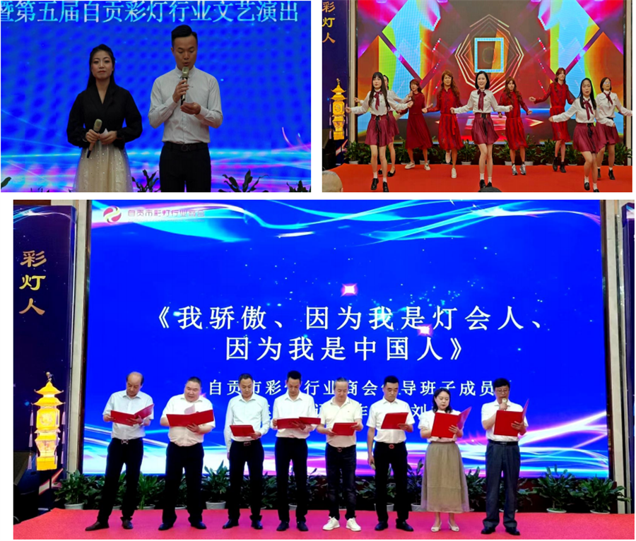 第五个议程:文艺演出。自贡市彩灯行业商会领导班子成员集体诗朗诵《我骄傲,因为是灯会人,因为我们是中国人》拉开了文艺演出的序幕,领导们铿锵有力的诗朗诵为大病初愈的彩灯行业树信心、鼓勇气;四川省众鑫彩灯文化传播有限公司、自贡市鹭燊文化旅游产业集团有限公司、自贡彩灯艺术团、四川天煜文化传播股份有限公司带来了精彩的文艺节目,体现了彩灯人不仅爱彩灯也热爱生活。